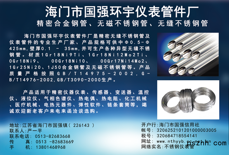 海門市國強(qiáng)環(huán)宇儀表管件廠 精密無縫不銹鋼管 儀表管件點(diǎn)擊:835 查看原圖![]() ![]() ![]() 公司名稱:海門市國強(qiáng)環(huán)宇儀表管件廠技術(shù)支持:網(wǎng)優(yōu)fengj.com客服中心 400-622-1112