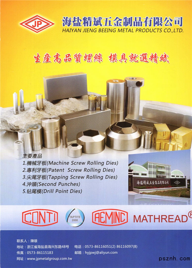 海鹽精斌五金制品有限公司 國際專利 機械牙板 尖尾牙板 沖頭點擊:845 查看原圖![]() ![]() ![]() 地址:浙江省海鹽縣海興東路48號 電話:0573_86116051(2)86116097(8);傳真:0573_86115183 郵箱:hyjpwj@a|iyun.com