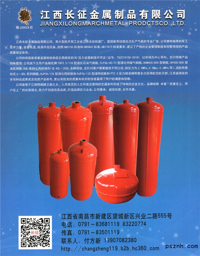 江西長征金屬制品有限公司 液化氣瓶類_鋼瓶_壓力噴漆桶點擊:838 查看原圖![]() ![]() ![]() 聯(lián)系人: 付方新 (董事長)立即交談加我微信 電話:0791-83220774手機:13907082380地址:中國江西省南昌市新建縣 江西省新建縣石崗鎮(zhèn)長征路7號公司主頁: //changzheng119.b2b.hc360.com