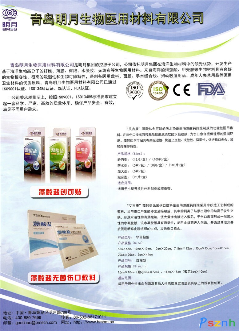 青島明月生物醫(yī)用材料有限公司 海藻酸鹽纖維 無(wú)紡布 敷料點(diǎn)擊:1501 查看原圖![]() ![]() ![]() 地址:青島市黃島區(qū)明月路788號(hào)