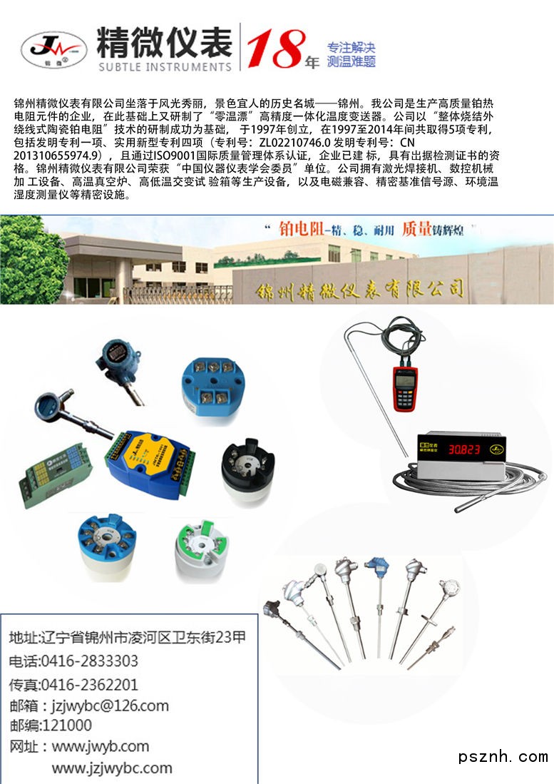 高質(zhì)量熱電阻_熱電偶_溫度顯示儀_控溫儀_熱式流量計(jì)_熱電阻_ 一體化溫度變送器_熱電偶_智能儀表_檢測(cè)儀器_多國(guó)儀表展-錦州精微儀表有限公司點(diǎn)擊:2748 查看原圖![]() ![]() ![]() 地址:遼寧省錦州市凌河區(qū)衛(wèi)東街23甲