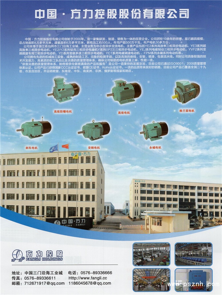| 公司簡介: | 中國·方力控股有限公司是一家集研發(fā)、制造、銷售為-體的民營企業(yè)。公司坐落于浙江省臺州市三門沿海工業(yè)城,主營業(yè)務(wù)為中小型異步交流電機,主要產(chǎn)品包括YBX3系列超高效率隔爆型三相異步電動機、YBF2系列風機用隔爆型三相異步電動機、YBD2系列多極變速隔爆型三相異步電動饑、YBVP2系列變頻調(diào)速專用隔爆型三相異步電動機、YE2系列高效率三相異步電動機、YE3系列超高效率三相異步電動機、YE2/Y2系列侶殼三相異步電動機、YQB系列液壓油泵專用三相異步電動機、Y系列(IP23)三相異步電動機、YK2系列螺桿壓縮機用三相異步電動機、YEJ系列電磁制動三相異步電動機、YVF2系列變頻調(diào)速專用三相異步電動機、YDT系列變極多速三相異步電動機、YD系列變極多速三相異步電動機、YCT系列電磁調(diào)速電動機、YJP系列拋光用三相異步電動機導。