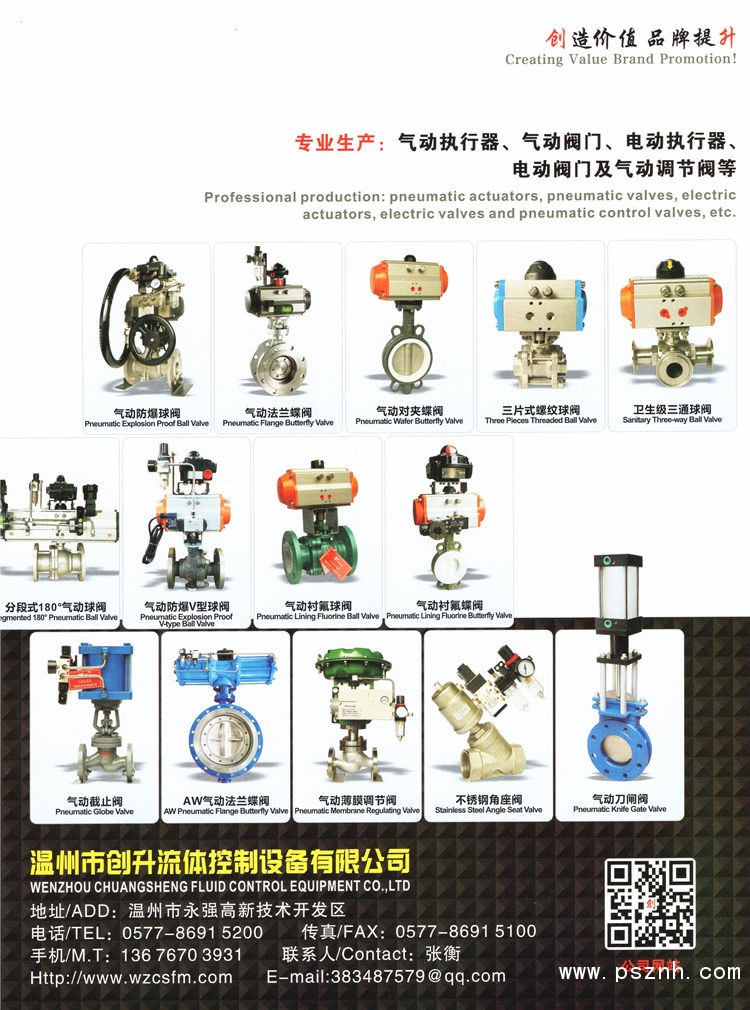 | 公司簡介: | 溫州市創(chuàng)升流體控制設(shè)備有限公司系中國閥門城理事單位,位于“中國閥門城”之稱的溫州市龍灣區(qū)中心工業(yè)區(qū)(永強(qiáng)高新園區(qū)),是一家集閥門執(zhí)行器及氣動閥門的生產(chǎn)、制造、銷售及售后服務(wù)為一體的科技型專業(yè)公司,公司技術(shù)力量雄厚,生產(chǎn)工藝先進(jìn)、完善的制造設(shè)備和精良的檢測設(shè)備及良好的管理機(jī)制,擁有多套立式加工中心、高精度數(shù)控機(jī)床,采用CAD三維模型創(chuàng)新優(yōu)化設(shè)計(jì)和CIMS計(jì)算網(wǎng)絡(luò)管理系統(tǒng)。 目前公司主要生產(chǎn):氣動執(zhí)行器、氣動閥門及氣動調(diào)節(jié)閥等產(chǎn)品,產(chǎn)品覆蓋國內(nèi)外各地,已為各行各業(yè),提供了大量的各種閥門執(zhí)行器、氣動閥門等,廣泛應(yīng)用于天然氣、電力、石油、化工、冶煉、制藥、造紙、印染、建筑、給排水、爐窯等行業(yè),普遍受到廣大用戶的贊譽(yù)。創(chuàng)升系列氣動執(zhí)行器及閥門是自動化流體控制工程及設(shè)備改造的首先品牌,以更優(yōu)越的質(zhì)量、服務(wù)嬴利客戶信賴。 公司為用戶咨詢、選型、設(shè)計(jì)、制造、安裝、調(diào)試、解決各種控制方案,我們秉承“質(zhì)量為根、誠信為本”的經(jīng)營理念、用心經(jīng)營我們的事業(yè),以客戶為中心,為用戶提供全程、全方位的公司宗旨,使你在擁有一個好產(chǎn)品的同時更擁有一個放心的服務(wù),我們的宣言:“用實(shí)力實(shí)現(xiàn)承諾”,誠摯地歡迎國內(nèi)外客戶考察指導(dǎo)、交流合作、能與您和作是我們的光榮”。溫州市創(chuàng)升流體控制設(shè)備有限公司