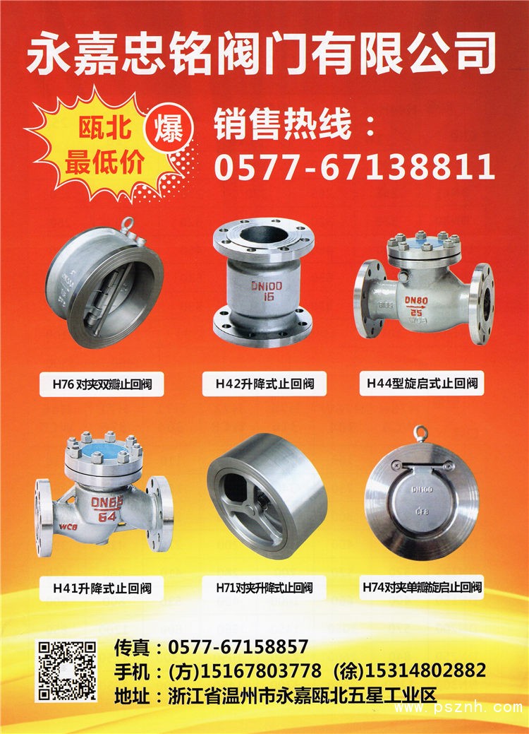 永嘉縣忠銘閥門有限公司 旋啟止回閥 對夾止回閥 升降式止回閥點擊:664 查看原圖![]() ![]() ![]() 永嘉縣忠銘閥門有限公司: