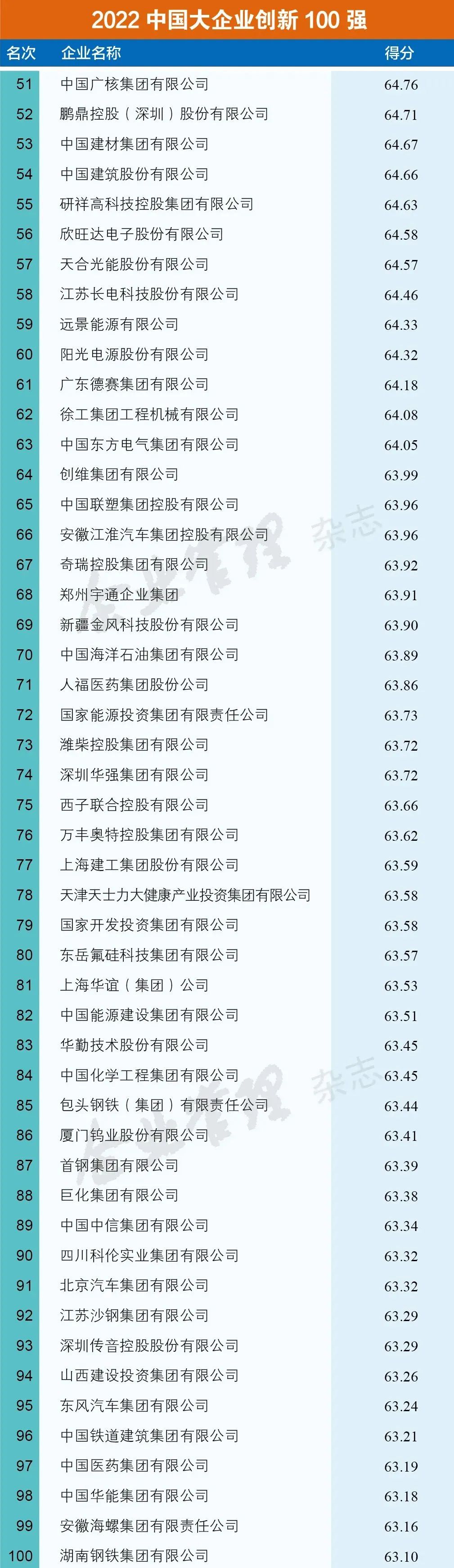 2022年9月6日,中國(guó)企業(yè)聯(lián)合會(huì)、中國(guó)企業(yè)家協(xié)會(huì)(簡(jiǎn)稱(chēng)中國(guó)企聯(lián))在京舉辦新聞發(fā)布會(huì),發(fā)布了“2022中國(guó)大企業(yè)創(chuàng)新100強(qiáng)”榜單。