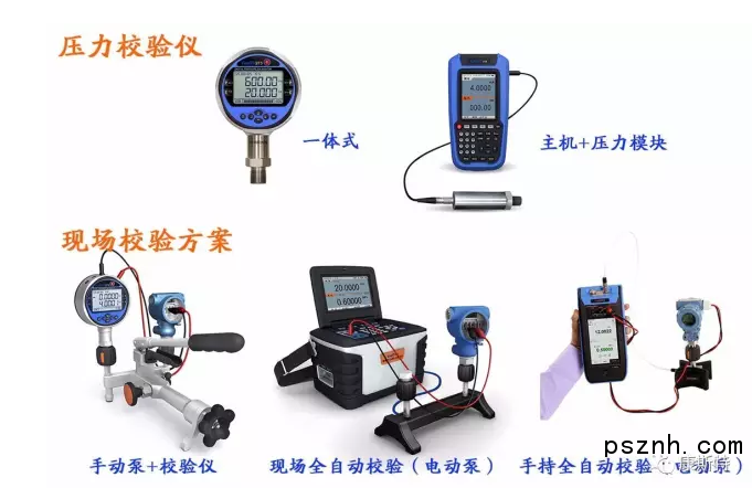 圖中上排左邊是ConST273智能壓力校驗(yàn)儀,為一體式設(shè)計(jì),外觀與數(shù)字壓力表相似;右邊則是采用多功能過(guò)程校驗(yàn)儀+數(shù)字壓力模塊組合成壓力校驗(yàn)設(shè)備,這種方式有點(diǎn)在于壓力模塊的精度和量程可根據(jù)需求自行選配。對(duì)于壓力儀表校驗(yàn),還需要提供壓力發(fā)生裝置。圖中下排左圖采用的是便攜氣壓泵手動(dòng)加壓,后面兩種方式為電動(dòng)泵自動(dòng)加壓,而且從便攜式升級(jí)到手持式,更方便現(xiàn)場(chǎng)使用。