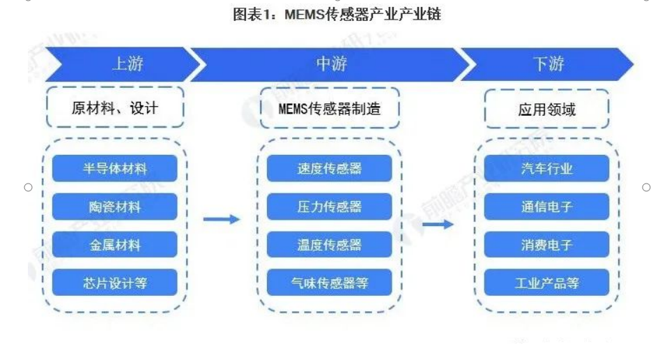⒈MEMS傳感器產(chǎn)業(yè)產(chǎn)業(yè)鏈全景梳理:MEMS傳感器應(yīng)用廣泛從產(chǎn)業(yè)鏈環(huán)節(jié)來看,MEMS傳感器產(chǎn)業(yè)的上游產(chǎn)業(yè)鏈包括原材料、芯片設(shè)計等。MEMS傳感器材料分半導(dǎo)體材料、陶瓷材料、金屬材料和有機材料四大類。下游應(yīng)用與工業(yè)、汽車電子產(chǎn)品、通信電子產(chǎn)品、消費電子產(chǎn)品、專用設(shè)備等相關(guān)聯(lián)。整體來看,MEMS傳感器產(chǎn)業(yè)上下游所涉及的領(lǐng)域范圍非常廣泛。