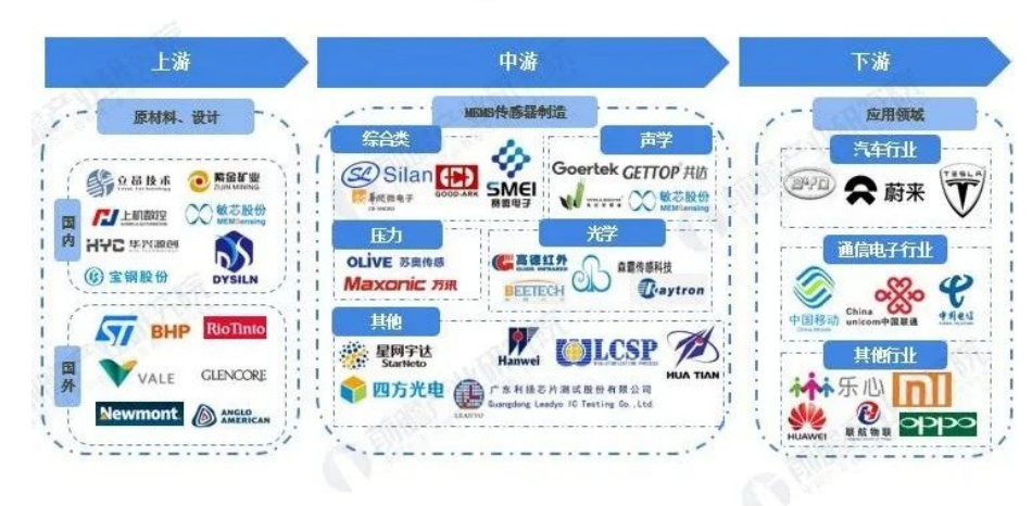 目前,我國MEMS傳感器上游原材料企業(yè)包括:立昂微(605358)、滬硅產(chǎn)業(yè)(688126)、上機數(shù)控(603185)、寶鋼股份(600019)等,國外企業(yè)包括巴西淡水河谷公司、澳大利亞必和必拓公司等。中游企業(yè)包括:士蘭微(600460)、賽微電子(300456)、華潤微(688396)、蘇州固锝(002079)、韋爾股份(603501)、歌爾股份(002241)和共達(dá)電聲(002655)等企業(yè)。下游應(yīng)用領(lǐng)域包括:比亞迪(002594)、樂心醫(yī)療(300562)和小米集團(01810.HK)等