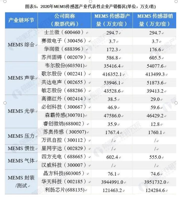 ⒊MEMS傳感器產(chǎn)業(yè)代表性企業(yè)產(chǎn)銷情況目前,布局了MEMS傳感器業(yè)務(wù)的上市企業(yè)中,歌爾股份(002241)在MEMS傳感器產(chǎn)銷規(guī)模方面處于優(yōu)勢地位(雖披露口徑為電子元器件,但鑒于公司主營MEMS傳感器業(yè)務(wù),故數(shù)據(jù)具有一定的參考性)。MEMS傳感器產(chǎn)業(yè)產(chǎn)業(yè)鏈上的其它代表性企業(yè)產(chǎn)銷情況如下:注:①統(tǒng)計的企業(yè)為公布相關(guān)產(chǎn)銷數(shù)據(jù)的上市企業(yè),未公布具體產(chǎn)銷數(shù)據(jù)的上市企業(yè)未納入統(tǒng)計中;②歌爾股份、士蘭微的產(chǎn)銷數(shù)據(jù)披露口徑分別為電子元器件和集成電路產(chǎn)品