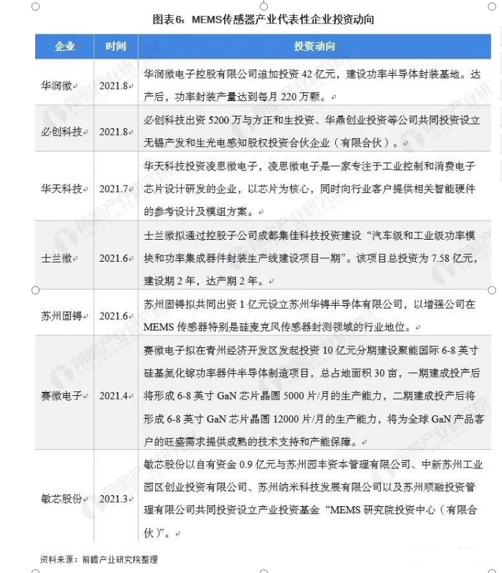 ⒋MEMS傳感器產(chǎn)業(yè)代表性企業(yè)最新投資動向2021年以來,MEMS傳感器產(chǎn)業(yè)代表性企業(yè)的投資動向主要包括收購公司拓展業(yè)務(wù)、通過對子公司增資的方式投資MEMS傳感器生產(chǎn)基地項目。MEMS傳感器產(chǎn)業(yè)代表性企業(yè)最新投資動向如下: