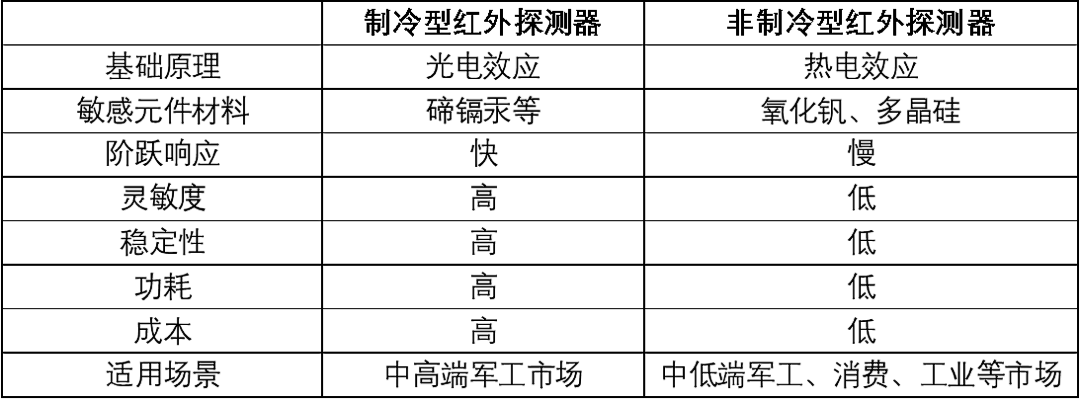 1 | 制冷型和非制冷型紅外探測(cè)器的對(duì)比(來源:信熹資本整理)