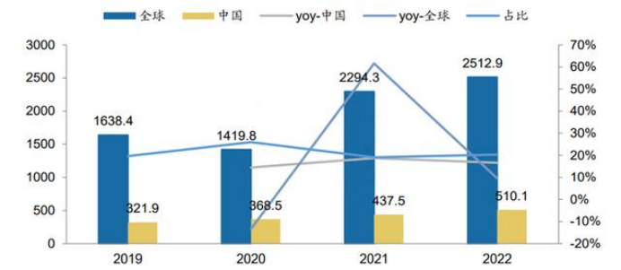 根據(jù)Statista,2022年全球傳感器市場(chǎng)規(guī)模為2512.9億美元(約1.79萬億人民幣)。受疫情影響,全球傳感器市場(chǎng)經(jīng)歷了大幅波動(dòng)。2020、2021和2022年同比增速分別為-13%、62%、10%。相比之下,中國(guó)市場(chǎng)增速相對(duì)穩(wěn)定,3年增速分別為14%、20%、19%,維持在20%上下。整體來看,中國(guó)市場(chǎng)占全球傳感器市場(chǎng)的比例維持在20%上下。