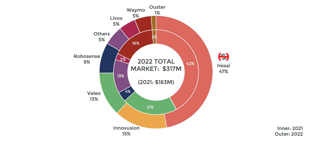 11 | 2021年和2022年全球激光雷達(dá)市場(chǎng)份額對(duì)比圖(來源:Yole)