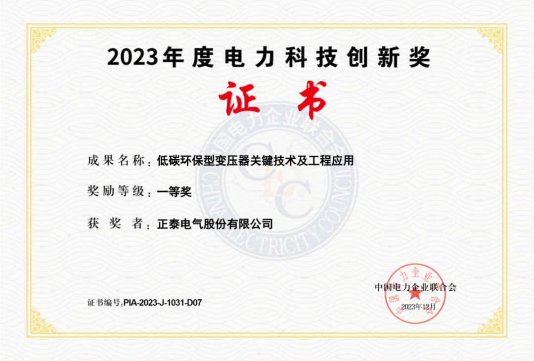 2023年12月,捷報(bào)再次傳來,由正泰電氣股份有限公司參與的《低碳環(huán)保型變壓器關(guān)鍵技術(shù)及工程應(yīng)用》項(xiàng)目,榮獲中國電力企業(yè)聯(lián)合會(huì)頒發(fā)的2023年度電力科技創(chuàng)新一等獎(jiǎng)。