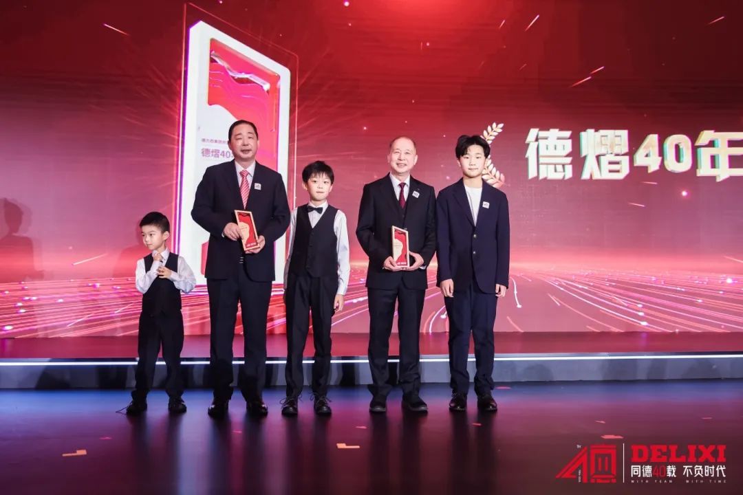 慶典前夕,德力西也為集團(tuán)所有入職超過20年的在職老員工制作了紀(jì)念獎(jiǎng)杯,因人數(shù)眾多,僅在晚宴現(xiàn)場(chǎng)為部分老員工代表頒獎(jiǎng)。德力西集團(tuán)高級(jí)副總裁、杭州德力西集團(tuán)董事長包秀杰為胡成虎等20年以上司齡的老員工代表頒發(fā)了“德輝20年”獎(jiǎng)杯。胡成國為包秀東等30年以上司齡的老員工代表頒發(fā)了“德耀30載”獎(jiǎng)杯。代表第三代德力西人的小朋友,為集團(tuán)兩位創(chuàng)始人胡成中、胡成國頒發(fā)了“德熠40年”獎(jiǎng)杯。