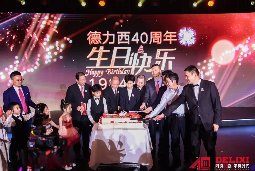 在兩位創(chuàng)始人的見證下,集團(tuán)與各一級(jí)企業(yè)的代表——胡煜鐄、樓峰、張永、包秀杰以及上海德力西集團(tuán)總裁胡涉琪、甘化科工總裁李忠、德新科技董事長邱嶺、資產(chǎn)集團(tuán)總裁宣剛、上德環(huán)??偛糜谘蠊餐虚_德力西40歲的生日蛋糕。