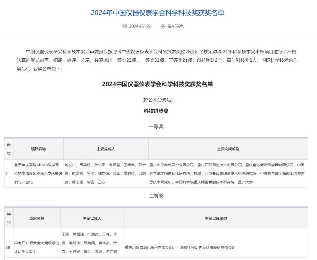日前,中國(guó)儀器儀表學(xué)會(huì)公布2024年中國(guó)儀器儀表學(xué)會(huì)科學(xué)技術(shù)獎(jiǎng)獲獎(jiǎng)名單,川儀股份牽頭的“基于自主高穩(wěn)MEMS敏感元件的高精度智能壓力變送器研發(fā)與產(chǎn)業(yè)化”項(xiàng)目榮獲科技進(jìn)步一等獎(jiǎng)“核電廠1E級(jí)安全殼淹沒液位計(jì)研制及應(yīng)用”項(xiàng)目榮獲科技進(jìn)步二等獎(jiǎng)。