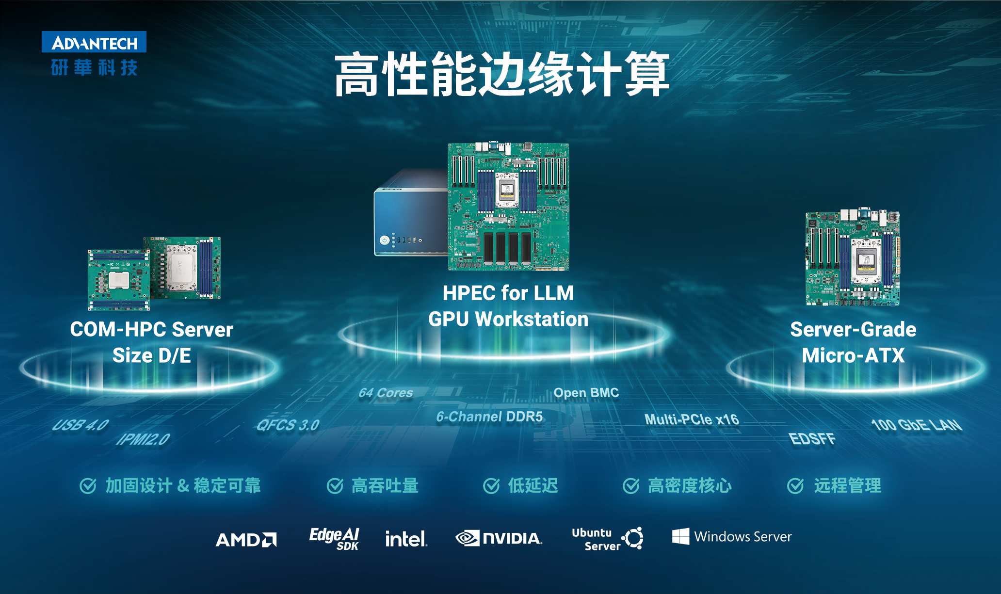 研華的邊緣計算解決方案具有高性能、高帶寬、高速度緊湊外形的特點。HPEC 系列進(jìn)一步以高密度處理器為核心,支持各種擴(kuò)展接口和 I/O、高帶寬數(shù)據(jù)傳輸,并可支持或集成高端 GPU 和 AI加速卡。HPEC系列在尺寸上比傳統(tǒng)服務(wù)器產(chǎn)品小30%至50%,可滿足日益增長的邊緣高性能計算需求。該系列包括搭載AMD高性能處理器的工業(yè)主板AIMB-592和AIMB-523、模塊化電腦SOM-E780和高性能邊緣計算系統(tǒng)AIR-520。此外,研華還提供包括 Edge AI SDK 在內(nèi)的軟件解決方案,以加快應(yīng)用集成效率。