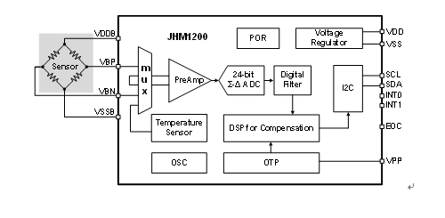 JHM1200是高分辨率24 位Σ△ADC。專門為智能手機、智能手環(huán)、GPS、高度計、氣壓計、運動手表、天氣預報器等氣壓傳感器應用而設計。工作溫度范圍-40~+85°C,工作電壓1.8~3.6V,傳感器補償后的準確度一般可以小于(±0.1%FSO@-25~+85°C)。結構框圖如下??商峁┞闫?、MSOP10封裝。