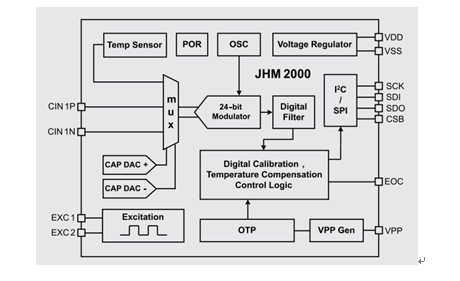 JHM2000是一款針對電容式傳感器設計的高精度信號調理芯片。待測的差分電容或單端電容與芯片直接連接,由芯片內(nèi)部的高精度24-bit Σ△CDC電路轉換為數(shù)字信號,其電容電容測量范圍:±4pF,分辨率最高可達10aF,約19.5 bit ENOB,線性度可達±0.01%。結構框圖如下??商峁┞闫?。