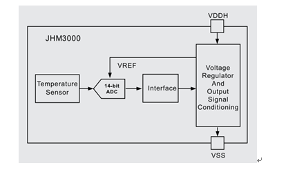 JHM3000是一款針對人體溫度測量的高精度溫度傳感器,它通過兩個引腳的簡單接口與外部連接,以單線數(shù)字通信協(xié)議輸出14bit溫度測量數(shù)據(jù),可以方便地連接各種單片機的GPIO。用戶通過簡單的單個溫度點校準,JHM3000可在32°C~42°C范圍內(nèi)達到±0.1°C的測量精度,溫度分辨率可小于0.01°C。結構框圖如下??商峁┞闫?br />