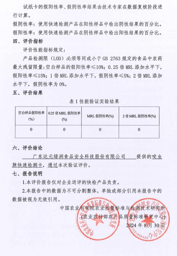 中國(guó)農(nóng)業(yè)科學(xué)院農(nóng)業(yè)質(zhì)量標(biāo)準(zhǔn)與檢測(cè)技術(shù)研究所(農(nóng)業(yè)農(nóng)村部農(nóng)產(chǎn)品質(zhì)量標(biāo)準(zhǔn)研究中心)于2024年8月組織開(kāi)展了蔬菜中農(nóng)藥殘留快檢產(chǎn)品評(píng)價(jià)工作。廣東達(dá)元綠洲食品安全科技股份有限公司提供的三唑磷、氯氟氰菊酯、甲氨基阿維菌素苯甲酸鹽、滅多威、氟蟲(chóng)腈、水胺硫磷、倍硫磷、毒死蜱、甲拌磷、啶蟲(chóng)脒、克百威和三羥基克百威等11種快速檢測(cè)卡參加了本次評(píng)價(jià),經(jīng)實(shí)驗(yàn)驗(yàn)證和專(zhuān)家復(fù)核,11種產(chǎn)品全部通過(guò)驗(yàn)證評(píng)價(jià)。