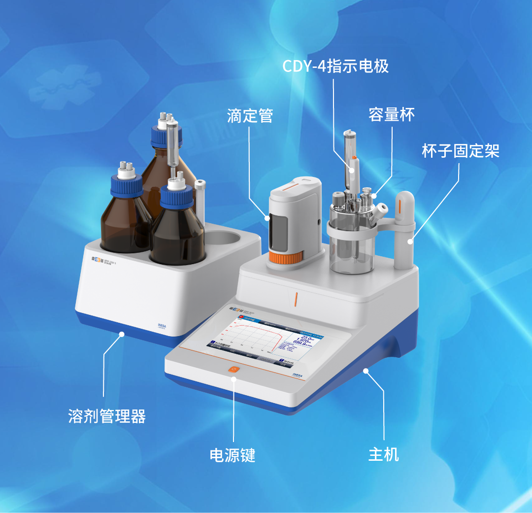 支持溶劑管理器,實(shí)現(xiàn)無污染測(cè)量分析過程:防漏液裝置和廢液瓶防倒吸裝置;全自動(dòng)進(jìn)液、排液、KF 試劑混合以及自動(dòng)清洗功能,有效防止用戶直接接觸 KF 試劑,保證測(cè)量和使用工作人員和環(huán)境的安全