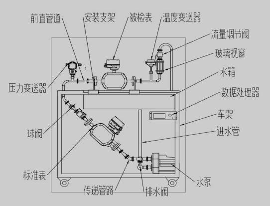 該裝置基于流體連續(xù)流原理,以標(biāo)準(zhǔn)表(如渦輪流量計(jì)、渦街流量計(jì)、電磁流量計(jì)、容積式流量計(jì)、科里奧利質(zhì)量流量計(jì)等)為主標(biāo)準(zhǔn)器,在相同時(shí)間間隔內(nèi)流體連續(xù)通過標(biāo)準(zhǔn)表和被檢流量計(jì),通過比較兩者的輸出流量值,確定被檢流量計(jì)的計(jì)量性能。根據(jù)液體不可壓縮的原理,在同一管道中任何時(shí)刻不同截面處的流量均相等,通過精確測(cè)量標(biāo)準(zhǔn)表與被檢表的脈沖信號(hào)計(jì)數(shù)及標(biāo)準(zhǔn)表的儀表系數(shù),利用特定公式計(jì)算得出被檢表的儀表系數(shù),從而實(shí)現(xiàn)對(duì)被檢流量計(jì)的標(biāo)定。