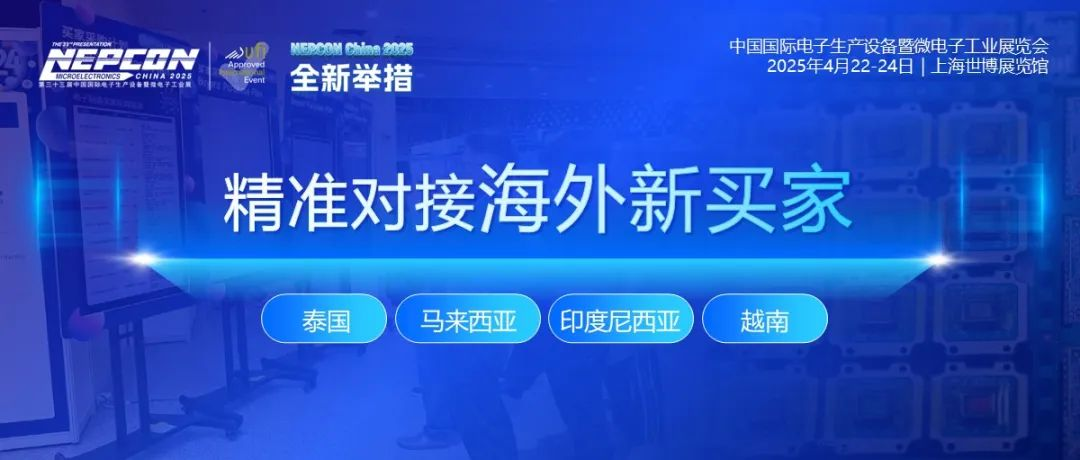 2025422日至24日,第三十三屆中國國際電子生產(chǎn)設(shè)備暨微電子工業(yè)展(以下簡稱NEPCON China 2025)將在上海世博展覽館拉開大幕。本屆展會已邀約來自越南、泰國、馬來西亞、印度尼西亞等海外電子制造企業(yè)新買家,以海外買家專場對接會+商貿(mào)導(dǎo)覽+主題參觀+商務(wù)交流+工廠參觀的多元形式,助力與海外新資源深度接洽,把握全球新商機(jī),拓展業(yè)務(wù)新商機(jī)!