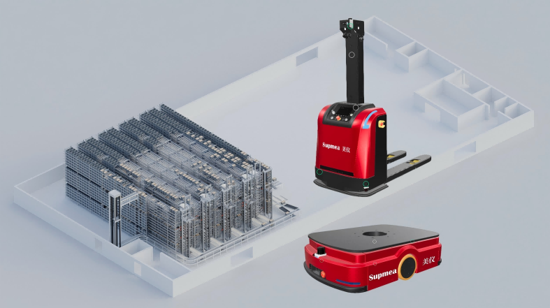 同時,4臺 AGV 也已同步部署運行,包括2臺潛伏式用于線邊配送、2臺叉車式用于大件搬運。系統(tǒng)采用SLAM激光導(dǎo)航技術(shù),具備自主路徑規(guī)劃與智能避障能力,可實現(xiàn)7×24小時連續(xù)作業(yè)。