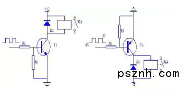 1、晶體管用來驅(qū)動繼電器,必須將晶體管的發(fā)射極接地。具體電路如下:NPN晶體管                             PNP晶體管 NPN晶體管驅(qū)動時:當(dāng)晶體管T1基極被輸入高電平時,晶體管飽和導(dǎo)通,集電極變?yōu)榈碗娖剑虼死^電器線圈通電,觸點RL1吸合。當(dāng)晶體管T1基極被輸入低電平時,晶體管截止,繼電器線圈斷電,觸點RL1斷開。PNP晶體管驅(qū)動電路目前沒有采用,因此在這里不作介紹。1.2       電路中各元器件的作用:晶體管T1可視為控制開關(guān),一般選取VCBO≈VCEO≥24V,放大倍數(shù)β一般選擇在120~240之間。。電阻R1主要起限流作用,降低晶體管T1功耗,阻值為2 KΩ。電阻R2使晶體管T1可靠截止,阻值為5.1KΩ。二極管D1反向續(xù)流,抑制浪涌,一般選1N4148即可。  2 集成電路2003驅(qū)動繼電器左圖1~7是信號輸入(IN),10~16是輸出信號(OUT),8和9是集成電路電源。右圖是集成塊內(nèi)部原理圖。