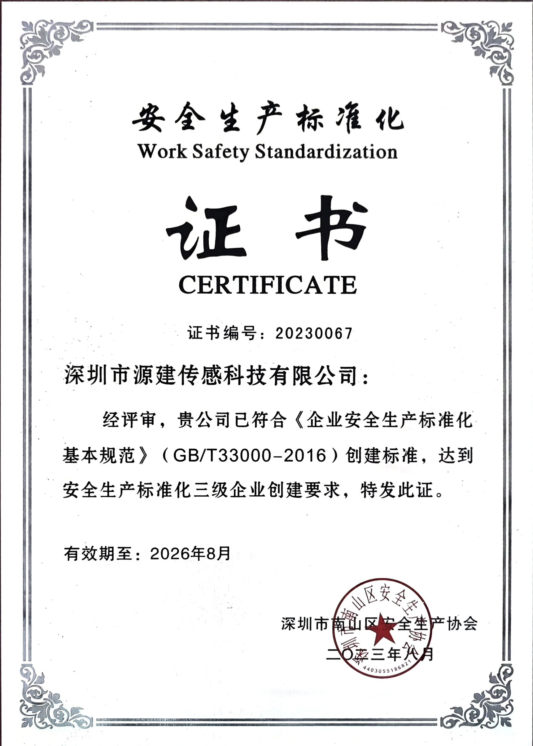 近日,深圳市源建傳感科技有限公司經過嚴格評審,成功達到安全生產標準化三級企業(yè)創(chuàng)建要求,獲得了由深圳市南山區(qū)安全生產協(xié)會頒發(fā)的《企業(yè)安全生產標準化基本規(guī)范》(GB/T33000-2016)創(chuàng)建標準證書。