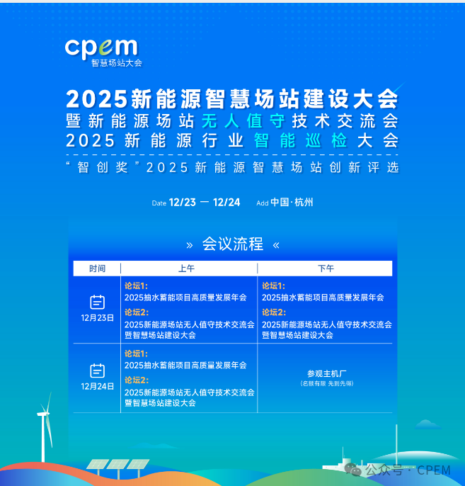 2025年12月23-24日,“2025 新能源智慧場站建設(shè)大會暨新能源場站無人值守技術(shù)交流會”將在杭州市盛大召開!同期舉辦“2025抽水蓄能項目高質(zhì)量發(fā)展年會”。