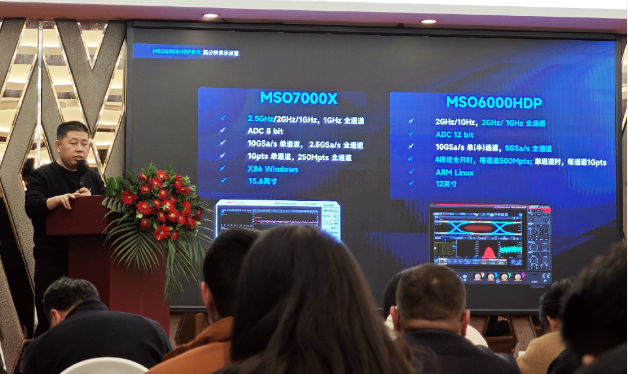 在產(chǎn)品分享環(huán)節(jié)中,測試儀器市場部工程師張亞博系統(tǒng)介紹了UPO70000系列數(shù)字熒光示波器、MSO8000HDP系列高分辨率示波器、MSO7000HD系列高分辨率示波器和MSO6000HDP系列高分辨率示波器等多款新品,重點解析了產(chǎn)品在高速、高精度及多通道測試方面的最新成果。