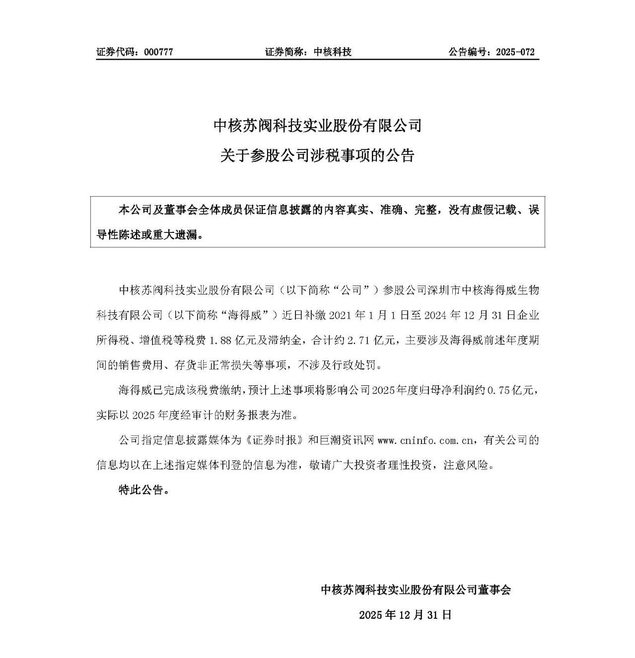 中核科技公告,中核蘇閥科技實業(yè)股份有限公司參股公司深圳市中核海得威生物科技有限公司近日補(bǔ)繳2021年1月1日至 2024 年12 月31 日企業(yè)所得稅、增值稅等稅費(fèi)1.88億元及滯納金,合計約2.71億元,主要涉及海得威前述年度期間的銷售費(fèi)用、存貨非正常損失等事項,不涉及行政處罰。