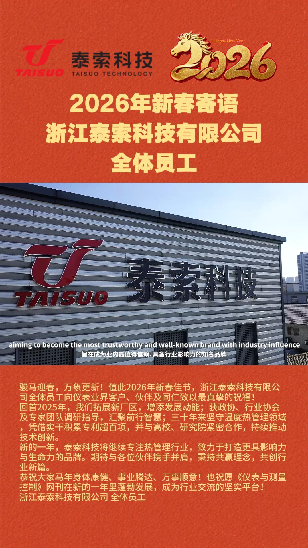 駿馬迎春,萬象更新!值此2026年新春佳節(jié),浙江泰索科技有限公司全體員工向儀表業(yè)界客戶、伙伴及同仁致以最真摯的祝福!