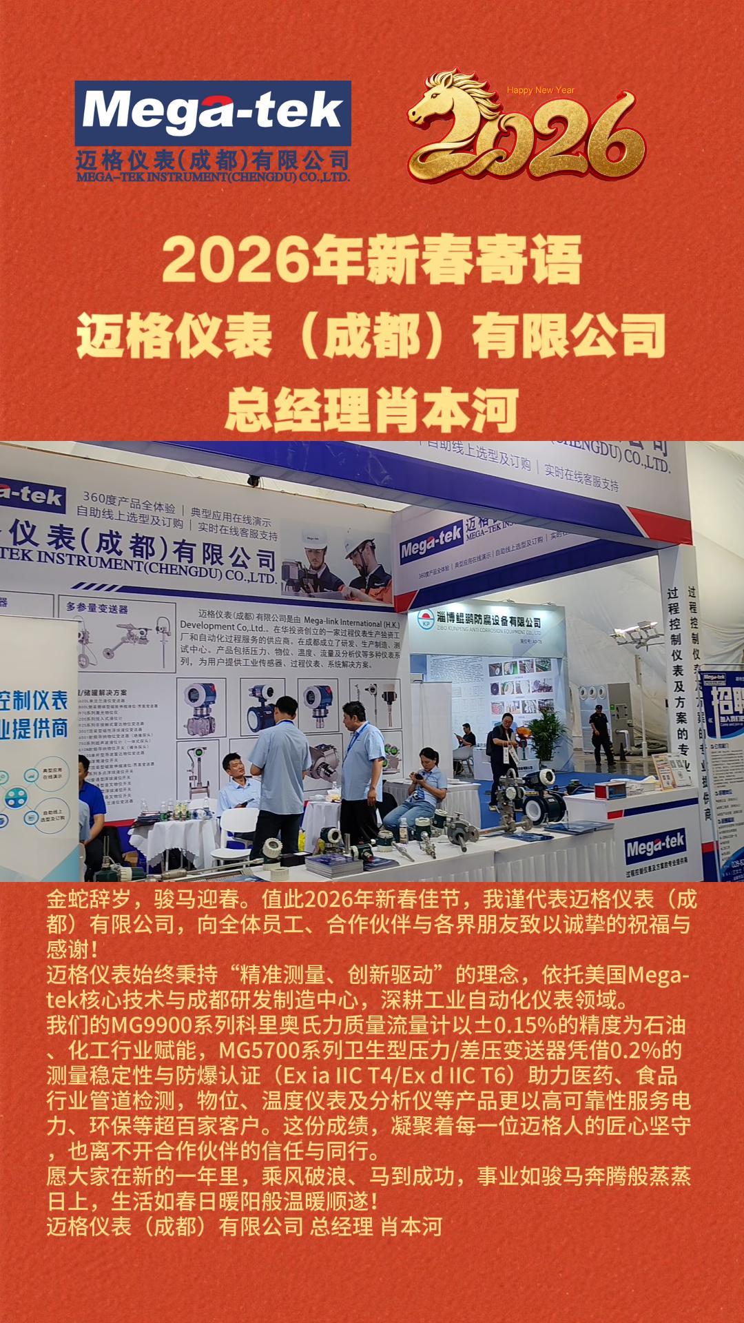 金蛇辭歲,駿馬迎春。值此2026年新春佳節(jié),我謹(jǐn)代表邁格儀表(成都)有限公司,向全體員工、合作伙伴與各界朋友致以誠(chéng)摯的祝福與感謝!