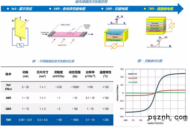 在現(xiàn)有技術(shù)中,有許多不同類(lèi)型的傳感器用于測(cè)量磁場(chǎng)和其他參數(shù),例如采用霍爾( Hall)元件,各向異性磁電阻(AMR)元件或巨磁電阻(GMR)元件為敏感元件的磁傳感器。TMR ( Tunnel MagnetoResistance)元件是近年來(lái)開(kāi)始工業(yè)應(yīng)用的新型磁電阻效應(yīng)傳感器,其利用的是磁性多層膜材料的隧道磁電阻效應(yīng)對(duì)磁場(chǎng)進(jìn)行感應(yīng),比之前所發(fā)現(xiàn)并實(shí)際應(yīng)用的AMR 元件和 GMR 元件具有更大的電阻變化率。我們通常也用磁隧道結(jié)來(lái)代指 TMR 元件, TMR 元件相對(duì)于霍爾元件具有更好的溫度穩(wěn)定性,更高的靈敏度,更低的功耗,更好的線(xiàn)性度,不需要額外的聚磁環(huán)結(jié)構(gòu);相對(duì)于 AMR 元件具有更好的溫度穩(wěn)定性,更高的靈敏度,更寬的線(xiàn)性范圍,不需要額外的 set/reset 線(xiàn)圈結(jié)構(gòu);相對(duì)于 GMR 元件具有更好的溫度穩(wěn)定性,更高的靈敏度,更低的功耗,更寬的線(xiàn)性范圍.