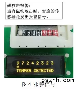 通過(guò)內(nèi)部算法,可以實(shí)現(xiàn)流量計(jì)的報(bào)警功能,即顯示“ Tamper detected”,如圖 4 所示。當(dāng)有一個(gè)磁鐵靠近字輪或者傳感器時(shí),傳感器模擬輸出電壓會(huì)超出正常范圍。通過(guò)設(shè)定閾值,可以實(shí)現(xiàn)“正常運(yùn)行”還是“收到攻擊”的判斷。當(dāng)外加磁場(chǎng)消失后,系統(tǒng)會(huì)自動(dòng)恢復(fù)到正常運(yùn)行的狀態(tài),即顯示“ Status normal”。