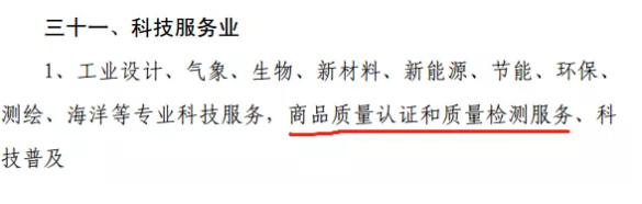 認(rèn)證君查閱《產(chǎn)業(yè)結(jié)構(gòu)調(diào)整指導(dǎo)目錄(2019年本,征求意見稿)》全文,質(zhì)量認(rèn)證和檢驗(yàn)檢測服務(wù)、標(biāo)準(zhǔn)化服務(wù)、計(jì)量測試等被列入鼓勵(lì)類第三十一大類科技服務(wù)業(yè)第一小類。截圖如下: