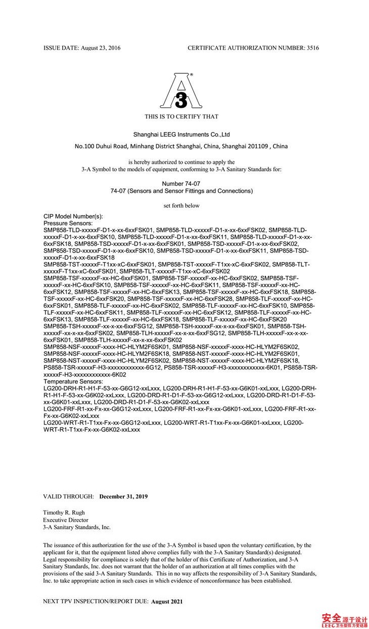 3-A標(biāo)準(zhǔn)組織《3-A Sanitary Standard for Sensors and Sensor Fittings and Connections,Number 74-07》正式生效,LEEG衛(wèi)生型壓力變送器3-A證書更新至74-07版本。以下是74-07版本的證書內(nèi)容: