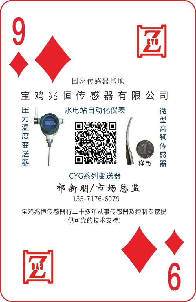 《2020圖頁儀表行業(yè)撲克牌》推出就得到寶雞兆恒傳感器有限公司總經(jīng)理祁新明的認同和支持,祁寶雞兆恒傳感器積極認領(lǐng)了方塊9做為此次的公司的專屬牌!