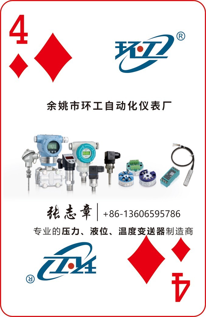 《2020圖頁(yè)儀表行業(yè)撲克牌》推出就得到 余姚市環(huán)工自動(dòng)化儀表廠總經(jīng)理張志章的認(rèn)同和支持,張總的環(huán)工自動(dòng)化儀表積極認(rèn)領(lǐng)了方塊4做為此次的公司的專屬牌!