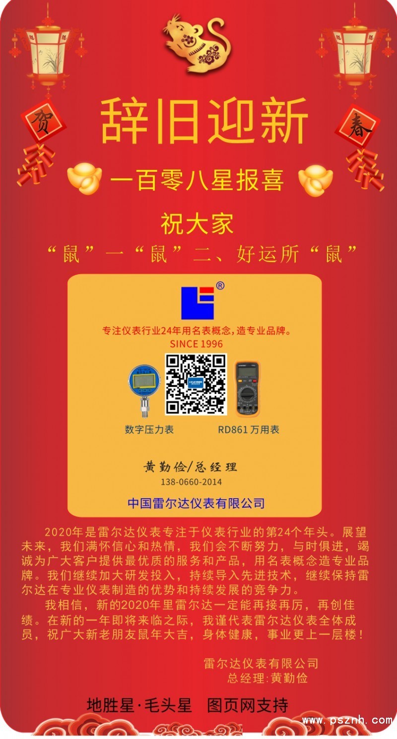 我相信,新的2020年里雷爾達(dá)一定能再接再厲,再創(chuàng)佳績。在新的一年即將來臨之際,我謹(jǐn)代表雷爾達(dá)儀表全體成員,祝廣大新老朋友鼠年大吉,身體健康,事業(yè)更上一層樓!