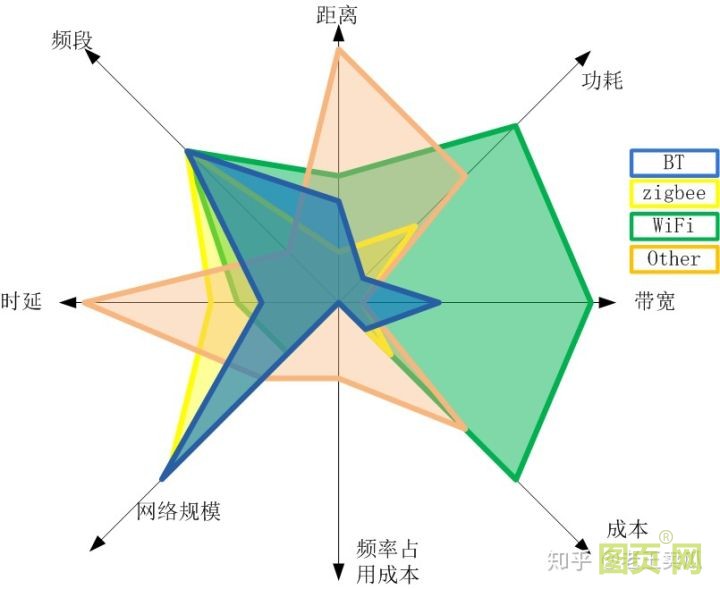 首先,我們看看不同的無線協(xié)議對(duì)應(yīng)的應(yīng)用場(chǎng)景,這是基本區(qū)分,標(biāo)志著協(xié)議面世的時(shí)候所對(duì)應(yīng)的主要場(chǎng)景。下圖是一個(gè)大概的概念圖,可以直觀感受一下各方的區(qū)別。