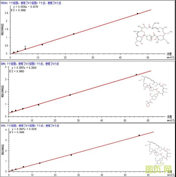 免疫抑制劑因其治療窗窄,在臨床應(yīng)用中需進(jìn)行治療藥物監(jiān)測(cè),所測(cè)值作為臨床評(píng)價(jià)療效及毒副反應(yīng)的指標(biāo)。傳統(tǒng)免疫學(xué)方法進(jìn)行血藥濃度監(jiān)測(cè)時(shí)特異性較差,不能完全區(qū)分免疫抑制劑與其代謝物;再者,其較大的分子量也加大了監(jiān)測(cè)難度。EXPEC 5210可實(shí)現(xiàn)3min內(nèi)完成3種免疫抑制劑——他克莫司、西羅莫司、依維莫司的濃度監(jiān)測(cè),線性、重復(fù)性良好。