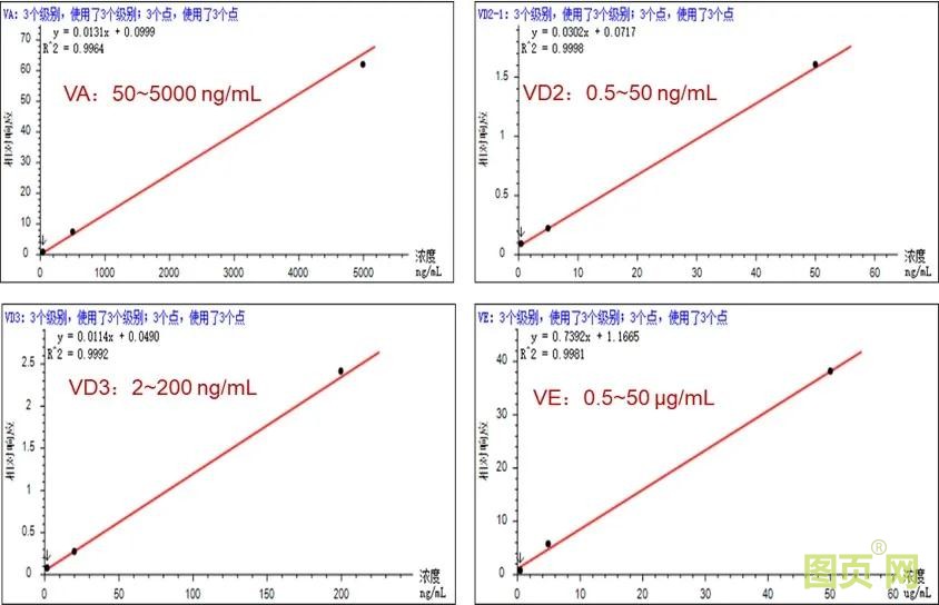 EXPEC 5210 針對(duì)維生素ADE的檢測(cè)采用梯度洗脫條件,在縮短分析時(shí)間的同時(shí)獲得了較好的去介質(zhì)及分離效果,一針進(jìn)樣可得到VA、25-OH-VD2、25-OH-VD3、VE檢測(cè)結(jié)果,滿足臨床的高通量需求。同時(shí)在前處理過程中添加同位素內(nèi)標(biāo)后,消除了不同基質(zhì)樣本中內(nèi)源性物質(zhì)對(duì)檢測(cè)物的影響,大大提高了檢測(cè)結(jié)果的準(zhǔn)確性。