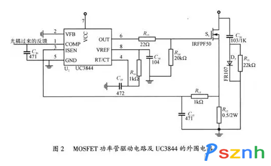 6腳為PWM波形輸出腳,驅(qū)動開關(guān)管的開、合,UC3844最大輸出電流可達1A。