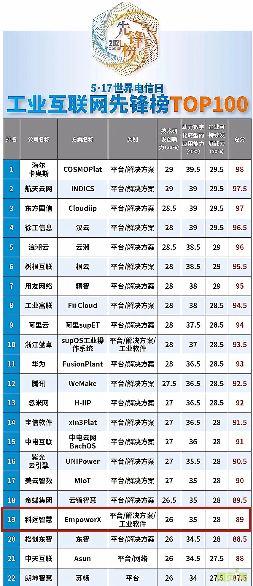 經(jīng)工信部《通信產(chǎn)業(yè)報(bào)》全媒體與《工業(yè)互聯(lián)網(wǎng)世界》權(quán)威公正的審核,科遠(yuǎn)智慧EmpoworX工業(yè)互聯(lián)網(wǎng)平臺(tái)從眾多參選企業(yè)中脫穎而出,排名19。