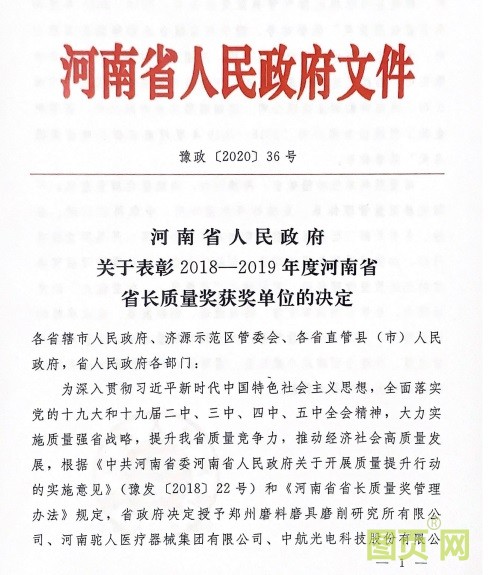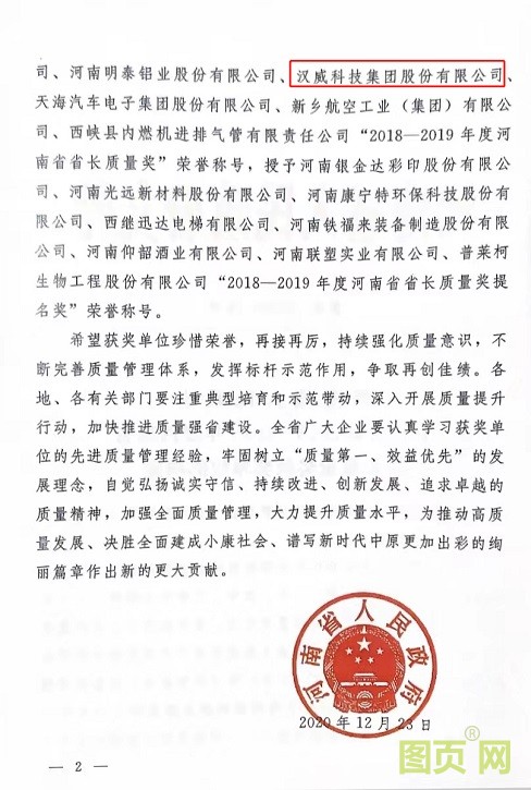 “河南省省長質量獎”是省政府設立的河南省最高質量榮譽獎,授予為建設質量強省做出突出貢獻、在全社會具有顯著示范帶動作用的單位。獲評省長質量獎,是漢威質量管理水平、綜合實力和品牌影響力顯著提升的有力證明,是省、市各級領導和專家對漢威質量管理、綜合管理水平的高度認可,是漢威2000多名員工對質量精益求精的成果。